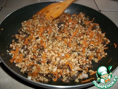 Начинка: Заранее отварить гречку, для начинки понадобится 1стакан, грибы, если нужно, предварительно отварить, у меня замороженные шампиньоны, я не отваривала. Морковь натереть на терке. Нарезанные грибы поджарить на сливочном масле, добавить морковь, потушить до готовности, добавить гречку, прованские травы, соль по вкусу. Начинка для блинов готова.