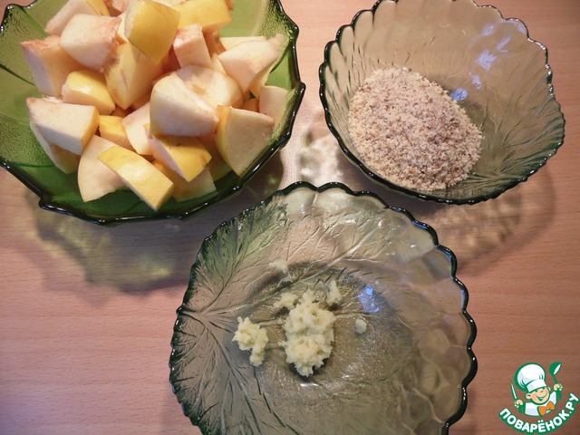Айву нарезать небольшими кубиками, имбирь натереть на мелкой терке, орехи измельчить.