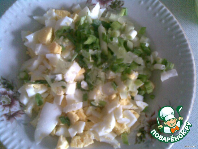 Яйца отвариваем,режем кубиками.Лук нарезаем.Смешиваем.
