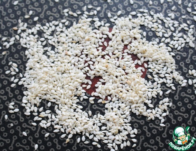 Кунжут обжарить на сухой сковороде до золотистого цвета. Важно взять свежий, качественный кунжут. Необходимо помнить, что семена кунжута быстро портятся, и от этого приобретают прогорклый вкус и запах.