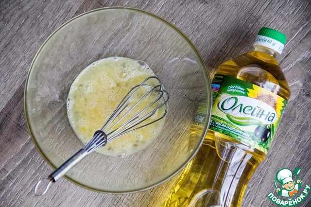 В миску разбить яйцо, добавить соль и взбить венчиком