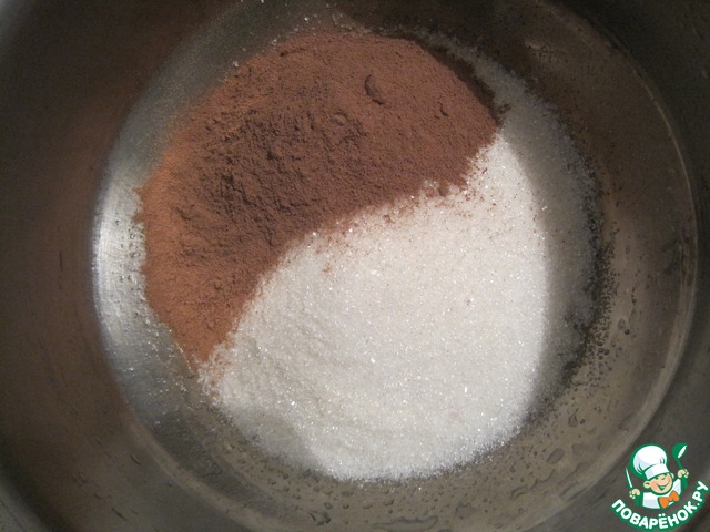 Готовим шоколадный соус. Сахар смешиваем с какао-порошком, чтобы не было комочков.