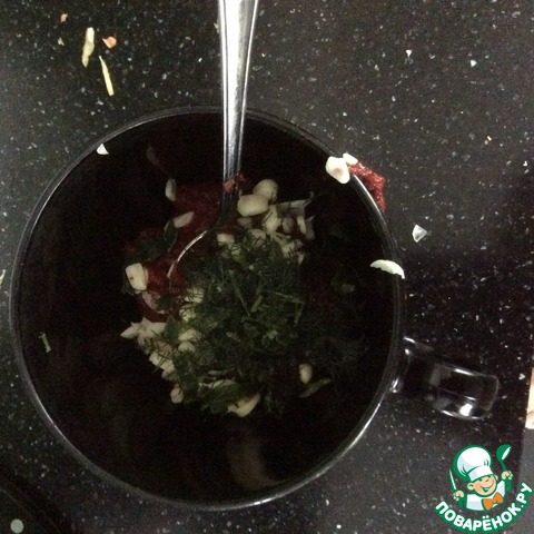 Смешать 2 ст. ложки томатной пасты, зелень (петрушку и укроп) они у меня замороженные. Чеснок почистить и мелко порубить.
