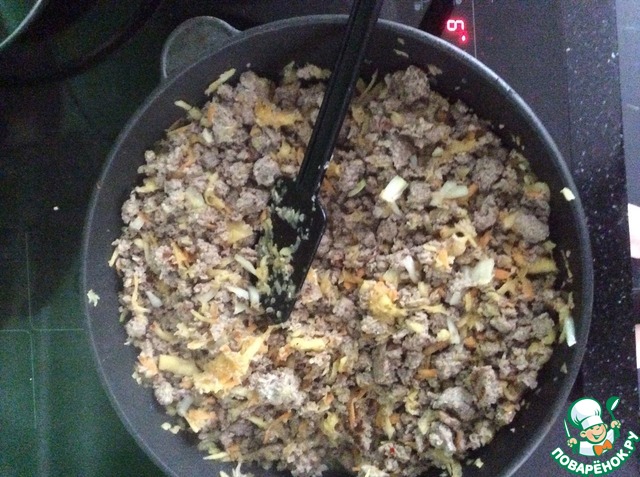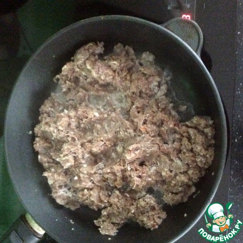Мясо обжарить немного на сковороде, поперчив, добавив острой приправы. Пока не начнёт испаряться сок. Это 5 мин