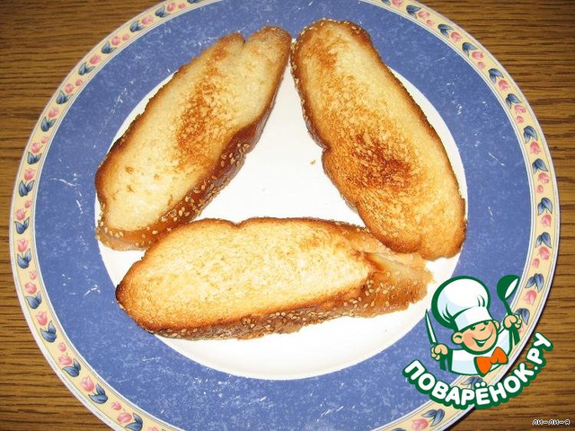 Белый хлеб нарезать ломтиками и обжарить с одной стороны на