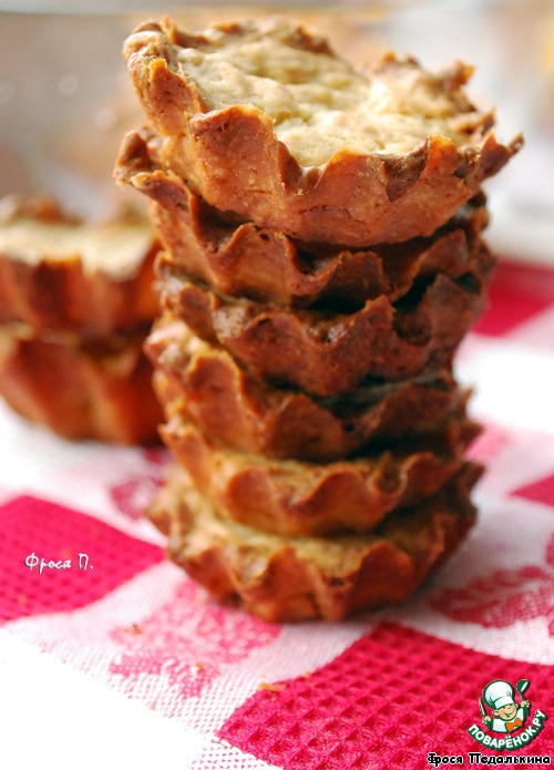 Разогреть духовку до 200 гр. Формочки для тарталеток смазать маслом, выложить тесто толщиной 2-3 мм. Честно говоря, рецепт теста брала из "Школы Гастронома", там рекомендуется выпекать 10 минут и потом охладить, накрыв полотенцем. Во время выпечки тесто вело себя несколько странно, масло шипело, поэтому время я увеличила до 20 минут. *SCRATCH*