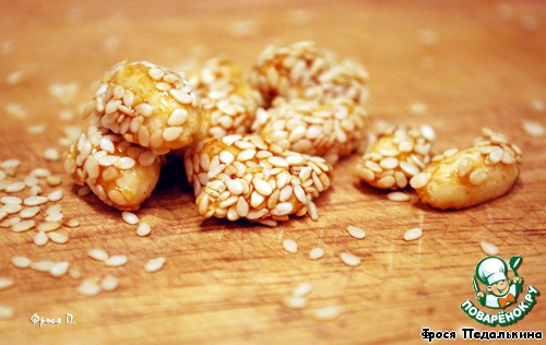 Мед растопить. Арахис слегка обжарить без масла, окунуть в мед и обвалять в кунжутных семечках.