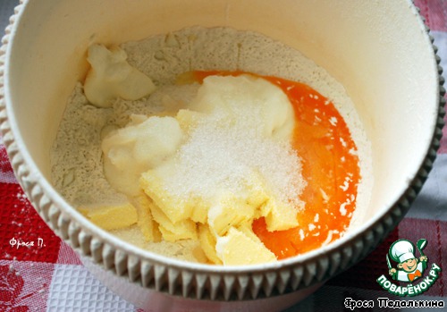 Добавить холодные желтки и сметану, 2 ст.л. сахара, быстро замесить тесто.