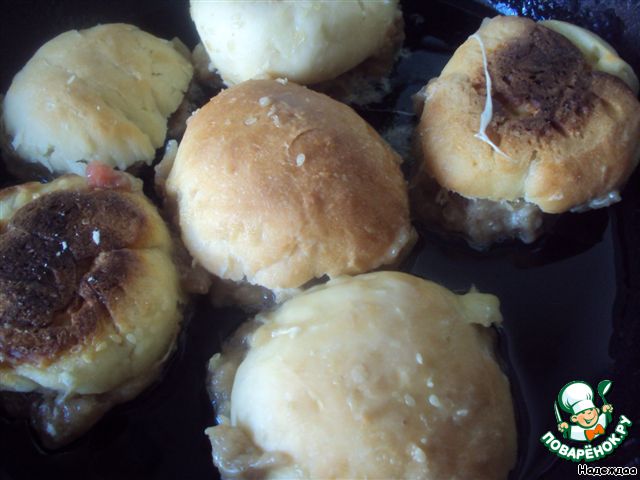 На разогретую сковороду с растительным маслом выложить бутерброды фаршем вниз и жарить 5-7 минут (до готовности фарша), затем перевернуть и обжарить хлеб.