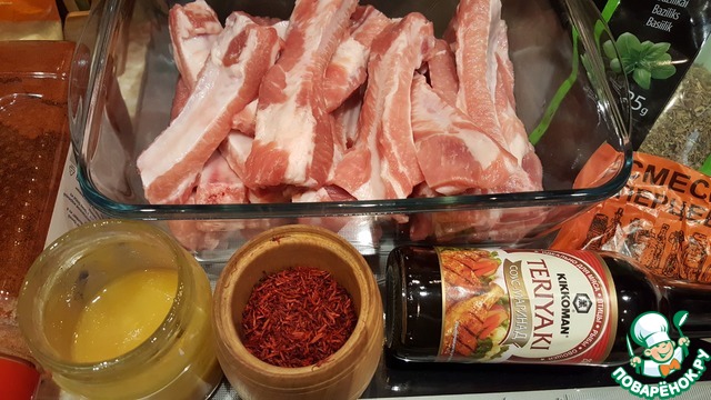 Промыть рёбра. Обсушить. Сложить в подходящую ёмкость и приготовить маринад.