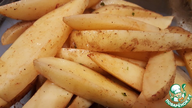 Хорошенько моем щёткой картофель. Разрезаем картофелины на дольки, промываем холодной водой и обсушиваем. Включаем разогрев духовки 180-200*.