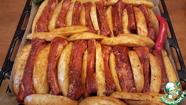 Выкладываем дольки картофеля между рёбрышек. При желании кладём на противень несколько перчиков чили.