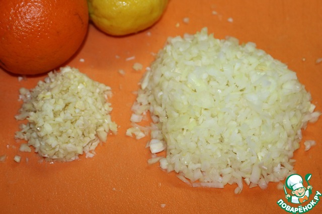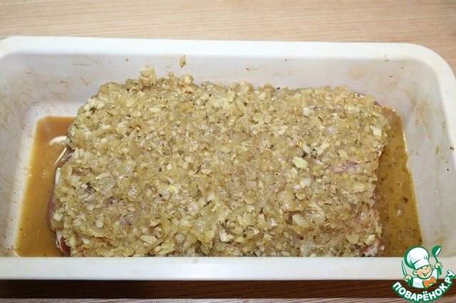 Сверху выливаем наш луково-цитрусовый соус. Накрываем фольгой и отправляем в разогретую духовку до 200 градусов на 40 минут. Затем, снимаем фольгу, поливаем соусом мясо и отправляем ещё на 50-60 минут (ориентируйтесь по своей духовке!) при температуре 180 градусов. За это время нужно несколько раз полить мясо.