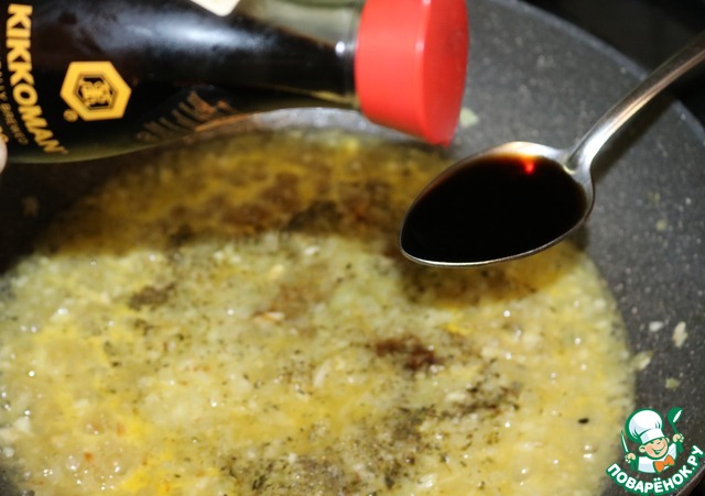 Добавляем чеснок, соевый соус и соки апельсина и лимона. Доводим до кипения, снимаем с огня.