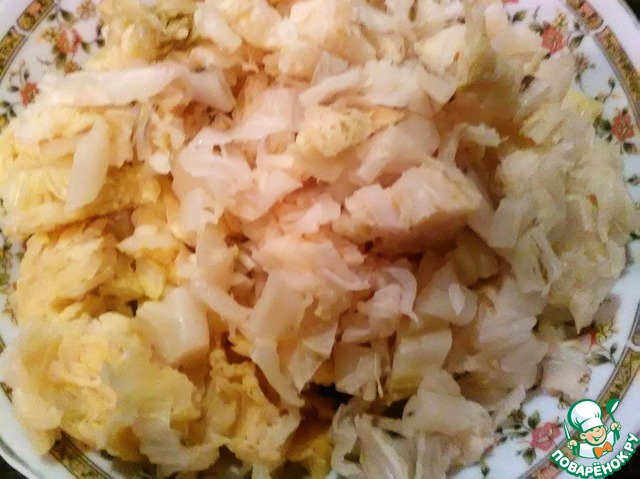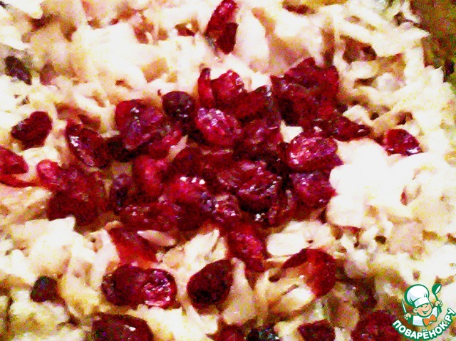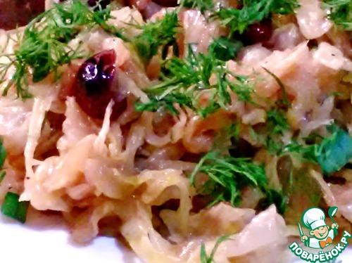 Когда лук размягчиться, добавляем к нему капусту. Тушим, помешивая, до готовности (примерно минут 40) и добавляем клюкву. Перемешиваем, выключаем плиту и оставляем под крышкой.