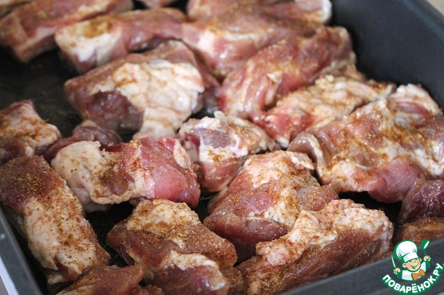 Специями посыпать сверху ребра. Накрыть форму фольгой и поставить в предварительно разогретую до 190 градусов духовку на 90 минут. Время приготовления зависит от размера ребрышек. У меня были очень маленькие, поэтому хватило 70 минут.