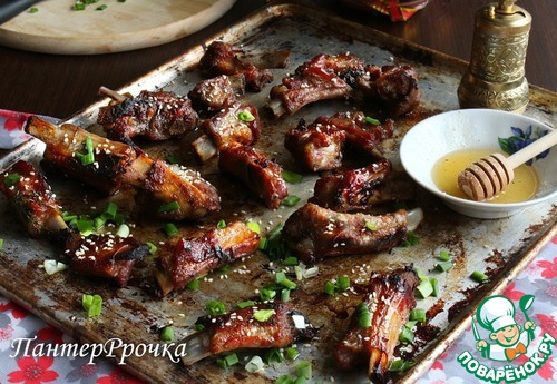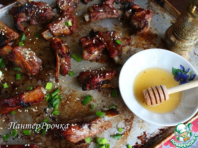 Каждые 25-30 минут ребрышки необходимо смазывать с обеих сторон медовой водой: для этого следует смешать мед с 1 ст. л. воды.