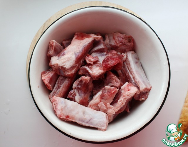 Свиные ребра вымыть и разрезать на части вдоль по косточкам.
