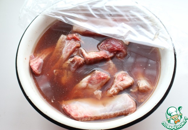 Чай процедить, залить им ребра. Накрыть пищевой пленкой и поставить в холодильник на 3-4 часа. Дольше мариновать не рекомендую, может проступить горчинка.