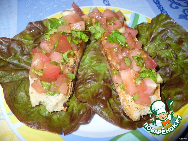 Чеснок очистить, разрезать пополам и натереть им хлеб. Затем каждый кусок хлеба полить 1 ст.л. оливкового масла, выложить на хлеб помидоры и сразу подавать на стол.