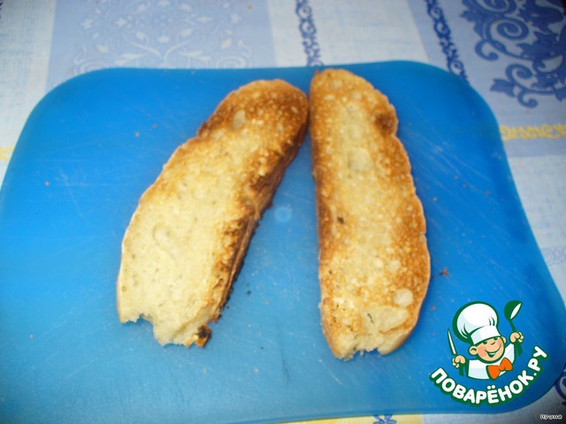 Кусочки белого хлеба поджарить в тостере. Лучше использовать чиабатту, как её испечь, можно посмотреть, например, здесь http://www.povarenok.ru/recipes/show/8314/