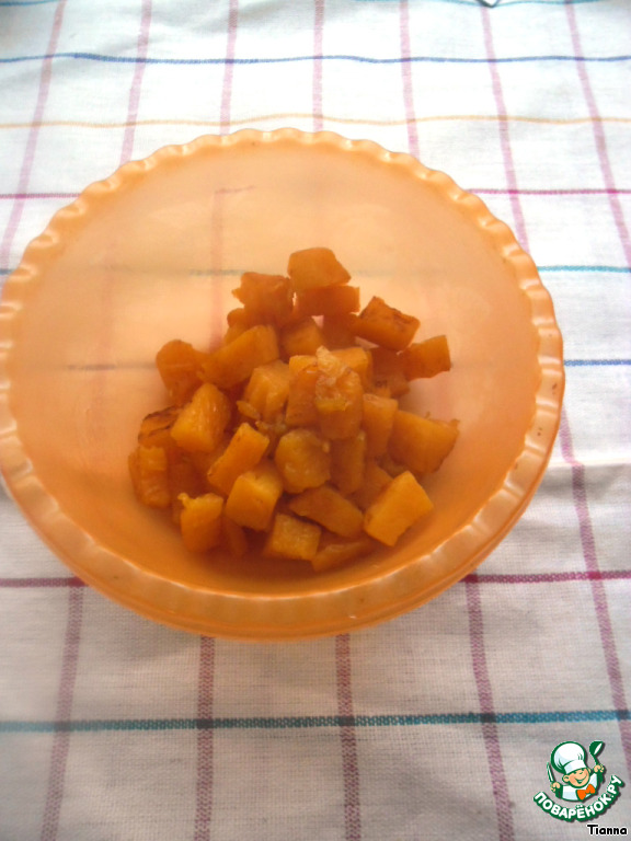 Для начала мы займемся тыквой. Я брала маринованную, поэтому ее просто немного обжарила. Если вы используете свежую тыкву, то ее нужно будет нарезать небольшими кубиками и поджарить в растительном масле до готовности (на среднем огне).