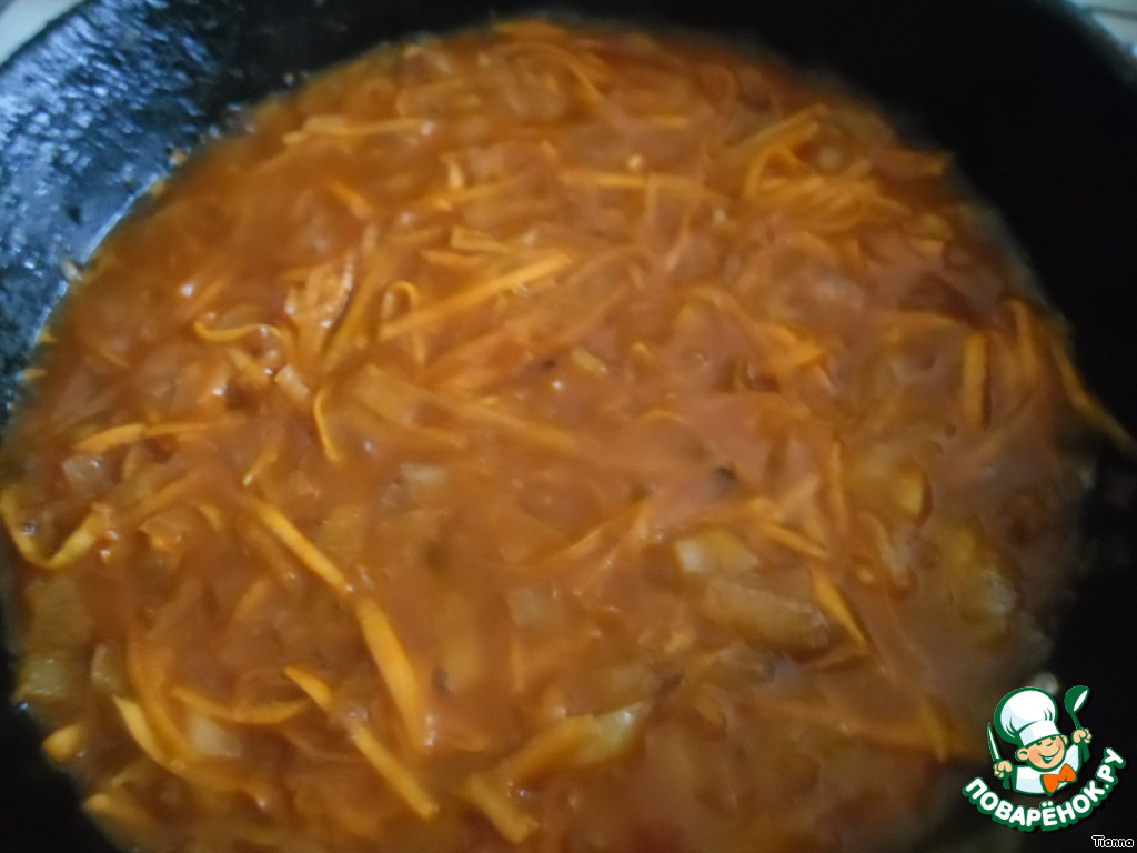 Лук нарезать мелкими кубиками, морковь натереть на средней или крупной терке. Выложить в сковороду лук и чуть-чуть обжарить. Затем добавить морковь и продолжить обжаривание. Добавить томат, соль, черный перец и любимые специи. Я брала красный молотый перец, мускатный орех и майоран. Далее туда же отправить мелко нарезанный чеснок и влить воду. Тушить на среднем огне до выпаривания жидкости.