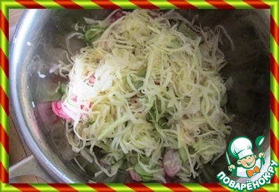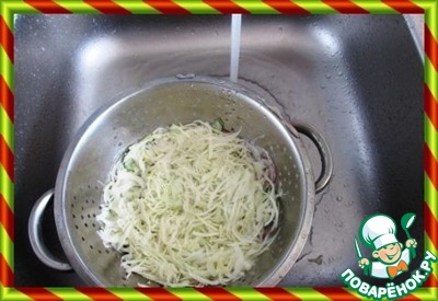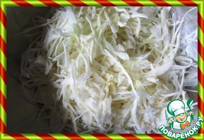 И мы нарезаем капусту тонкой соломкой или мелкими квадратиками
