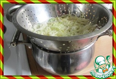 На кастрюлю ставим большой дуршлаг и выкладываем половину нарезанной капусты, посыпаем капусту солью, примерно 1/4 столовой ложки.