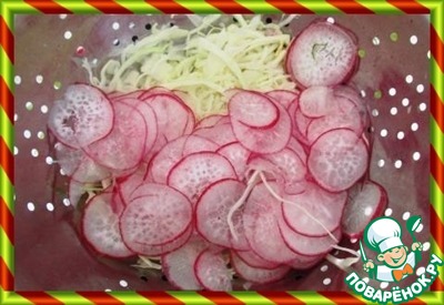На слой капусты выкладываем редис. Снова посыпаем солью - 1/4 ст. л.