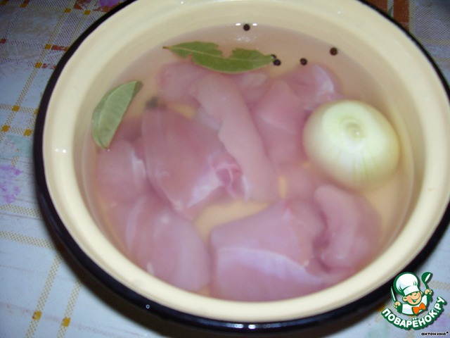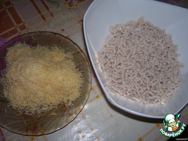 Твердый сыр натереть на мелкой терке, отварное куриное филе пропустить через мясорубку (можно и то и другое измельчить в блендере). Взбить миксером.
