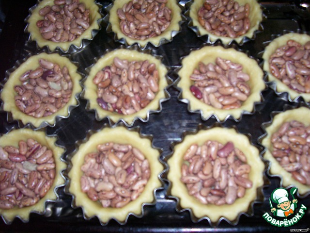 Раскатать тесто, вырезать круги. Круги из теста уложить в смазанные маслом формочки. Насыпать фасоль в формочки, чтобы тарталетки не потеряли форму при выпечке.