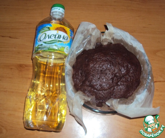 Обкладываем форму, в которой будем выпекать наш пирог (у меня пиала) бумагой для выпечки, смазываем растительным маслом и выкладываем тесто.
