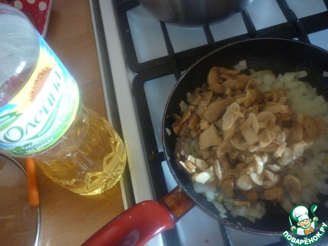 Лук порезать кубиками и обжарить его вместе с нарезанными грибами на растительном масле около 3-4 минут. Добавить мускатный орех и соль.