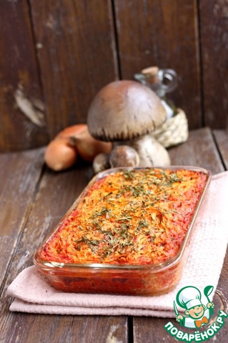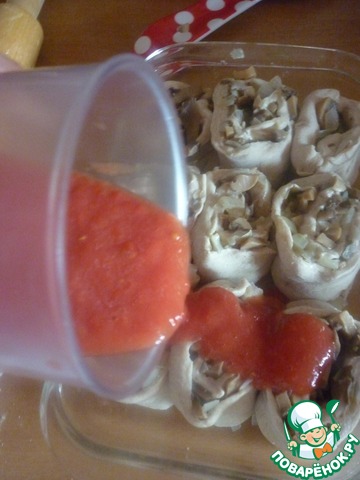 Свернуть в рулет и нарезать на кусочки толщиной 1,5-2 см. Уложить в огнеупорную посуду.