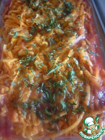 Морковь натереть на крупной тёрке и выложить на рулетики. Посыпать зеленью и добавить лавровый лист.